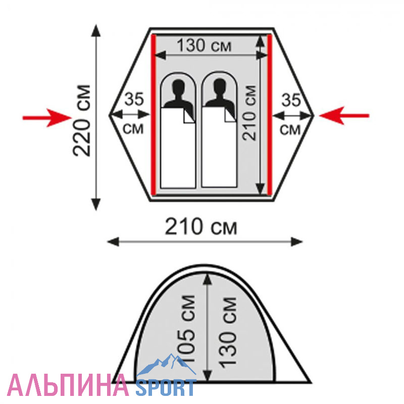 Два входа — удобно входить/выходить из палатки. Также они обеспечивают проточную вентиляцию — актуально для летнего отдыха.