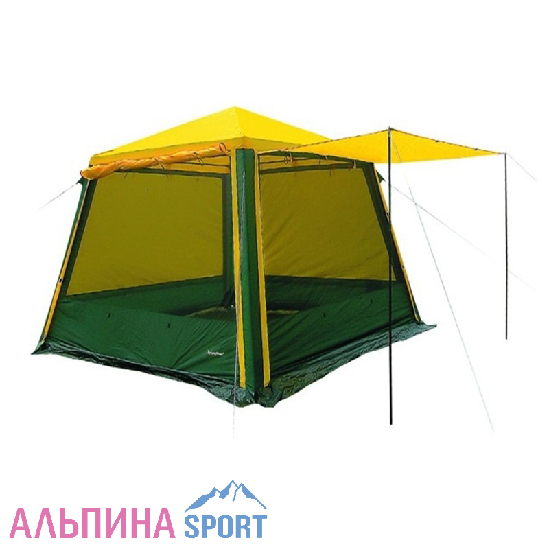 Шатер для устройства полевой кухни, столовой или штабной палатки. Швы проклеены. Четыре входа продублированы москитной сеткой. Две стойки для установки козырька над любым из входов. Верхние скаты шатра и углы изготовлены из прочного 300 D полиэстра. Ветрозащитная юбка по периметру. Восемь ветровых оттяжек.