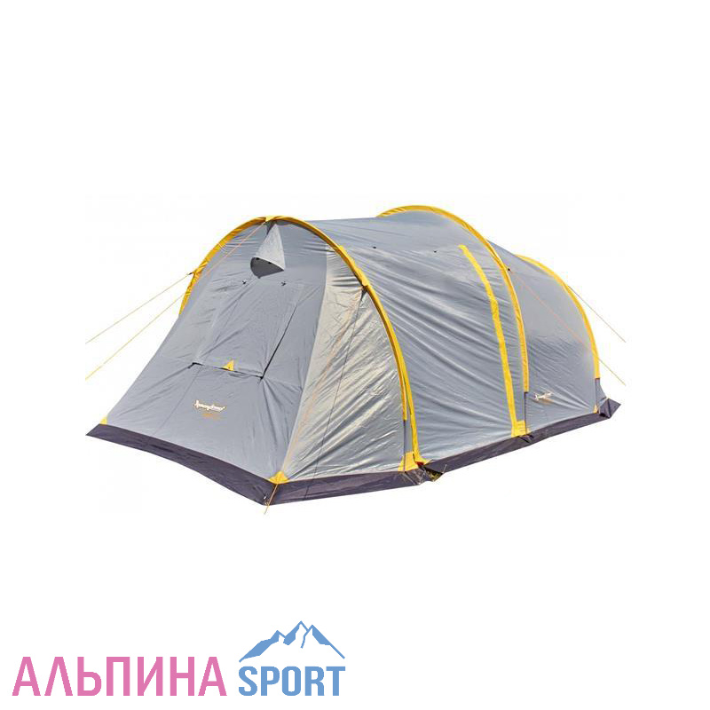 RockLand Nomad 4+1 кемпинговая палатка ангарного типа c двумя входами и одним большим тамбуром. Москитная сетка на входе в тамбур, на входе во внутреннюю палатку и на вентиляционных окнах. Съемный пол в тамбуре. Для защиты от солнца и дождя можно установить козырек перед входом. Палатка оборудована большим количеством карманов. При желании возможна установка и без внутренней палатки. В комплект поставки входит установочный комплект: каркас, колышки и растяжки.