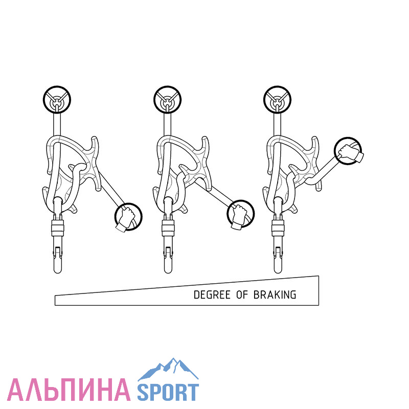 Три разные степени торможения. Перед началом спуска следует выбрать нужное положение веревки с учетом веса пользователя, диаметра веревки и рельефа.