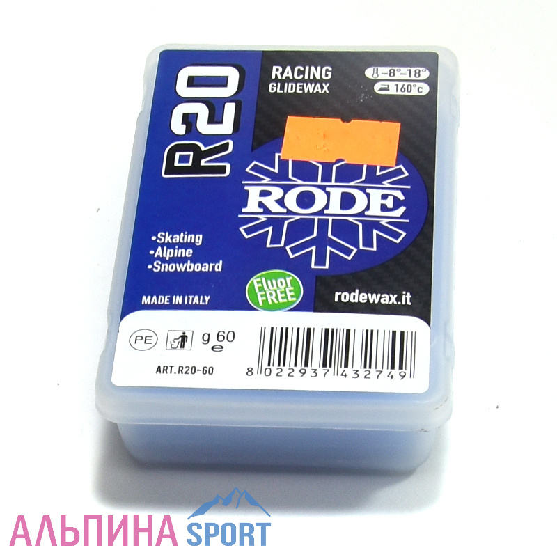 Синтетический парафин Rode R20 Blue для очень холодных условий. Идеален для тренировок и для соревнований при влажности воздуха меньше 30%.